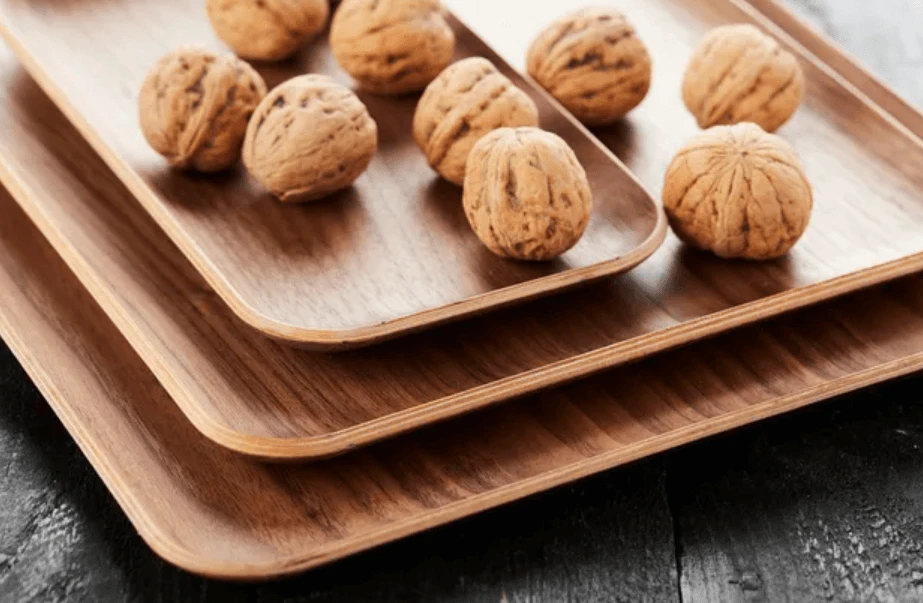 Dit rechthoekige dienblad van Point-Virgule is gemaakt van stevig multiplex in een elegante, moderne vorm en heeft een walnoot look. Het dienblad heeft een lengte van 33 cm, een breedte van 23 cm en een hoogte van 1,5 cm. Gebruik het dienblad voor het dragen en serveren van bijvoorbeeld drank en gebak.