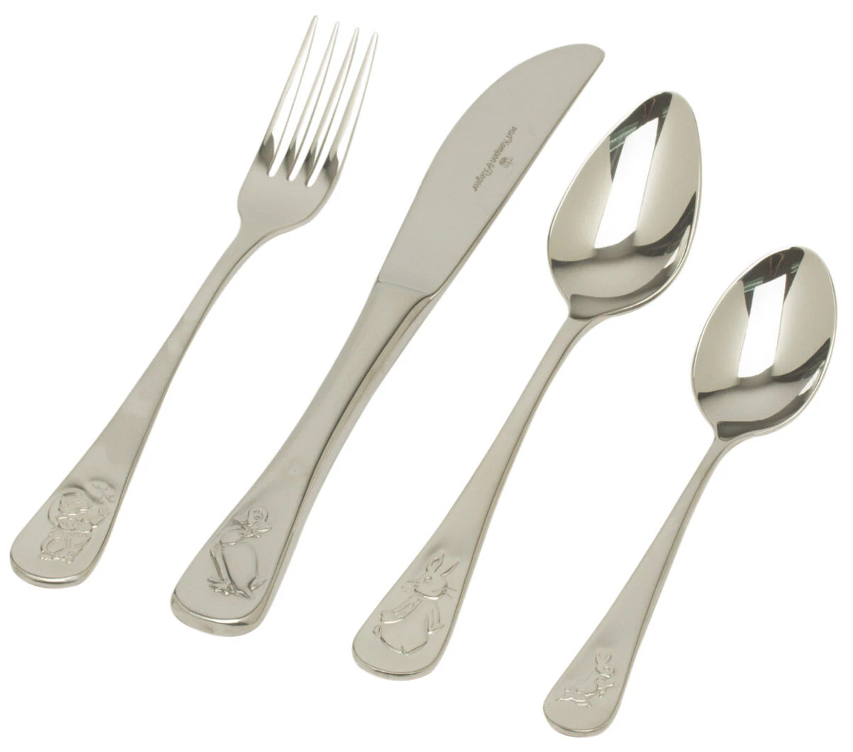 Het Van Kempen & Begeer Junior kinderbestek is voorzien van afbeeldingen van Peter Rabbit en zijn vrienden: de figuren uit de verhalen van Beatrix Potter. Op het mes staat Jemima Puddle-Duck, op de vork Tom Kitten. Peter Rabbit zelf siert de eetlepel en op de dessertlepel vindt u Mrs. Tittlemouse. Het mes is 17 cm lang, de vork en lepel elk 16 cm en de dessertlepel meet 13 cm in lengte.